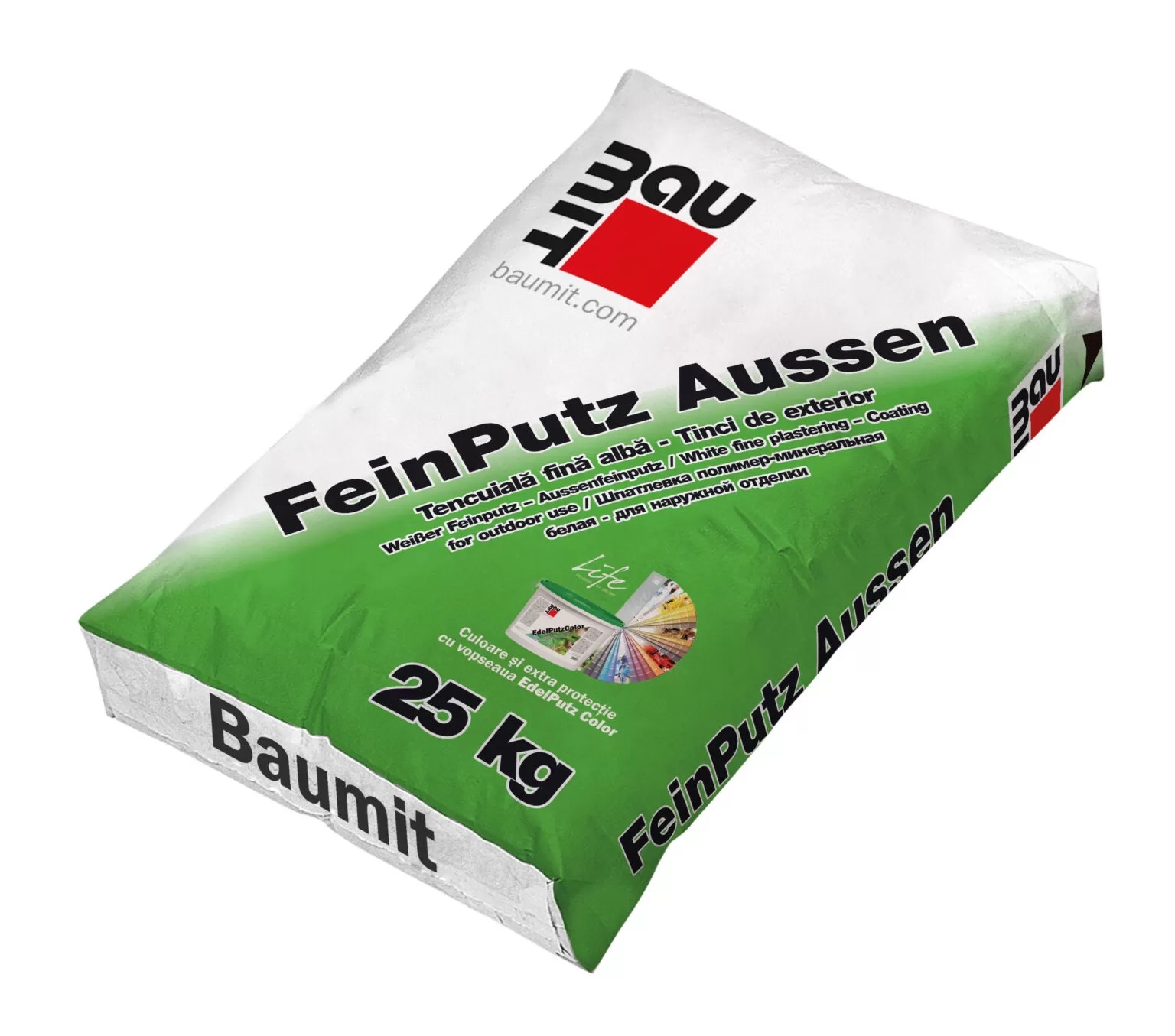 Tencuiala Baumit Feinputz Aussen este un mortar uscat, de culoare alb natur, cu permeabilitate ridicata la vapori, pentru executarea manuala a tencuielilor fine, utilizat ca tinci pentru suprafete exterioare sau interioare.