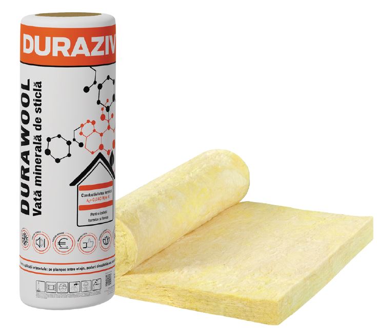 Saltele din vată minerală de sticlă DURAZIV DURAWOOL, conductivitate termică λD = 0.040 W/mK, pentru toate tipurile de izolații termice și fonice supuse unor sarcini mecanice reduse, cu plasarea vatei în plan orizontal (pe planșeu) cum ar fi: pe planșee între etaje, pe planșeele podurilor circulabile (sub placare cu lemn, sau similară) și pe planșeele podurilor necirculabile. Coeficientul de conductivitate termică λ = 0.040 W/(m*K). Rezistență scăzută la trecerea vaporilor de apă μ = 1. Clasa de reacție la foc A1 = incombustibil. Temperatură maximă de utilizare 200°C. Durată lungă de viață și stabilitate în timp a proprietăților. Nu este agreat de insecte, rozătoare sau paraziți. Neutru din punct de vedere chimic, nu conține materiale corozive.
